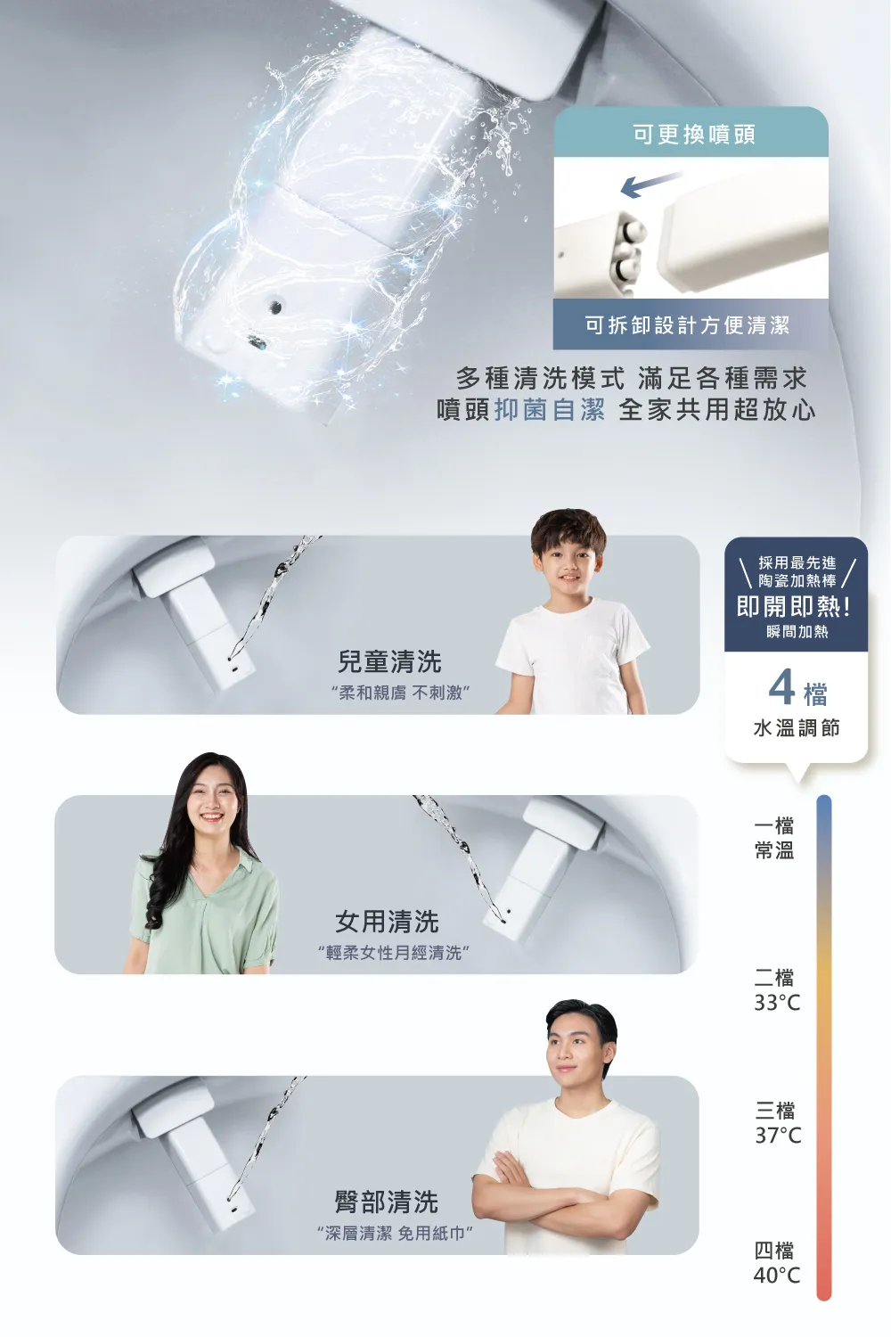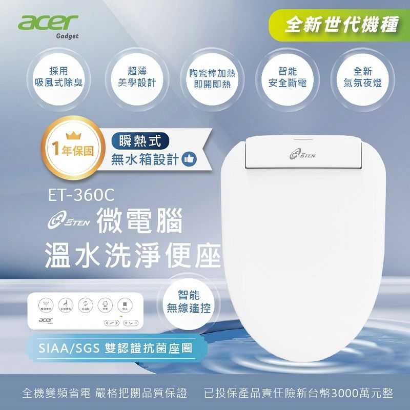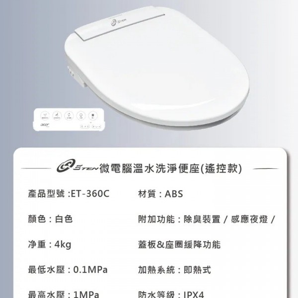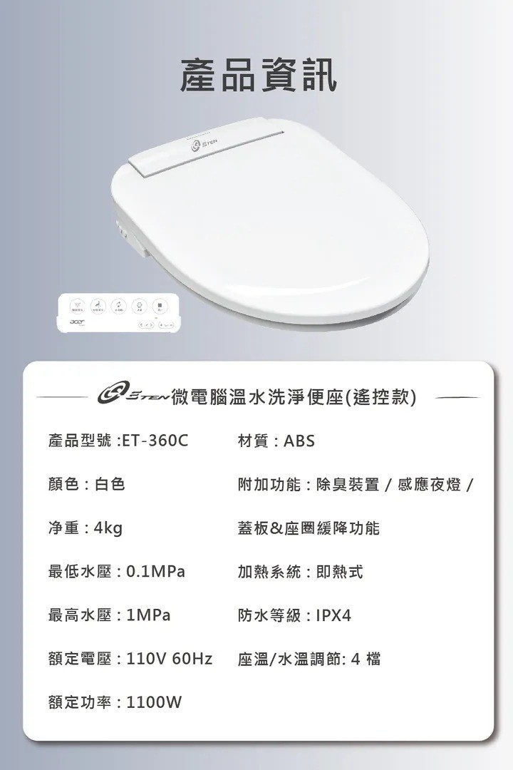 型號:ET-360C 廠牌:ACER gadget 材質:ABS 顏色:白色 淨重:4GK 最低水壓:0.1MPa 最高水壓:1MPa 額定電壓:110V 60Hz 額定功率:1100W 附加功能:除臭裝置/感應夜燈/蓋板&座圈緩降功能 加熱系統:即熱式 防水等級:1PX4 座溫/水溫調節:4檔